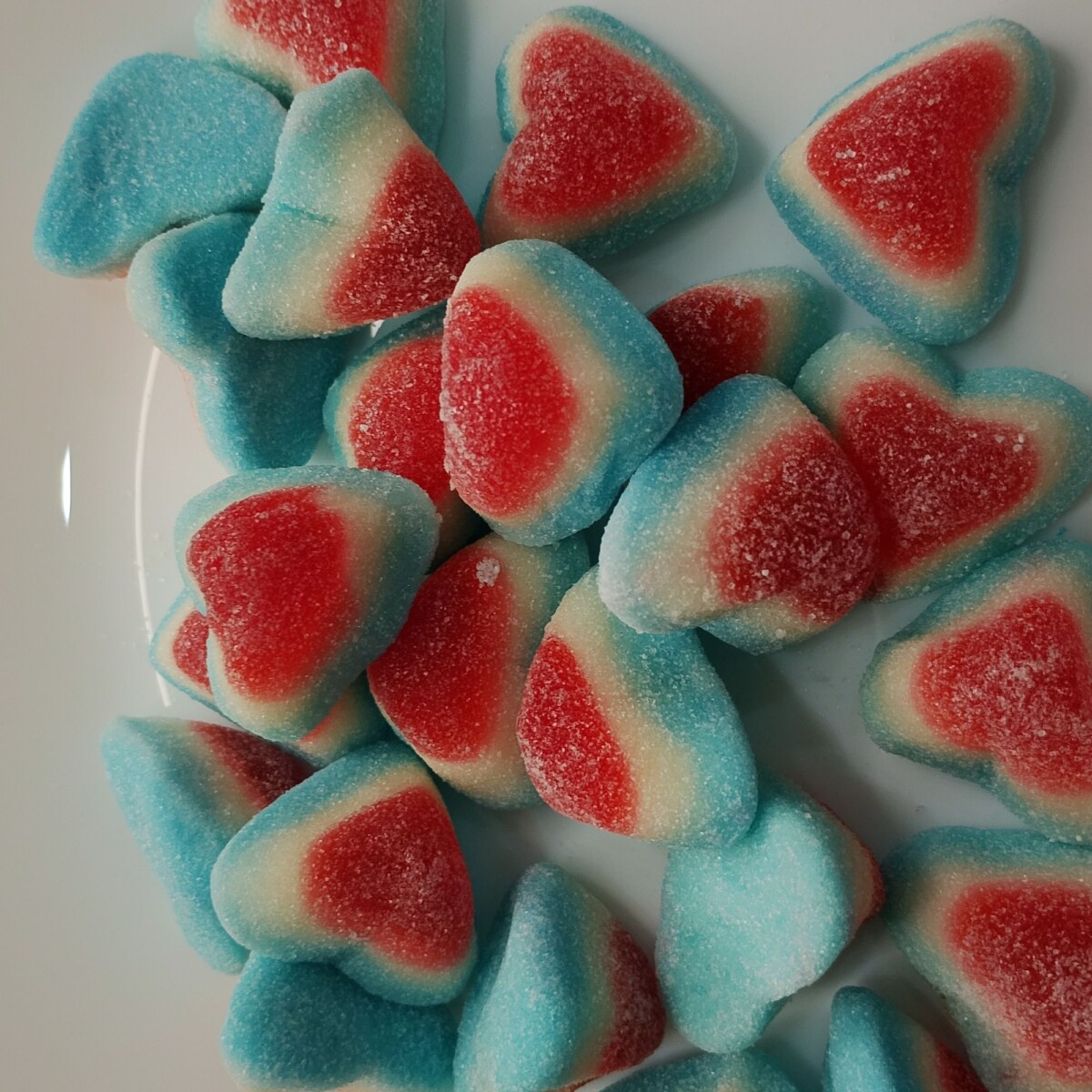 Żelki w kształcie czerwono-biało-niebieskich serduszek o smaku owocowym w kwaskowej posypce.